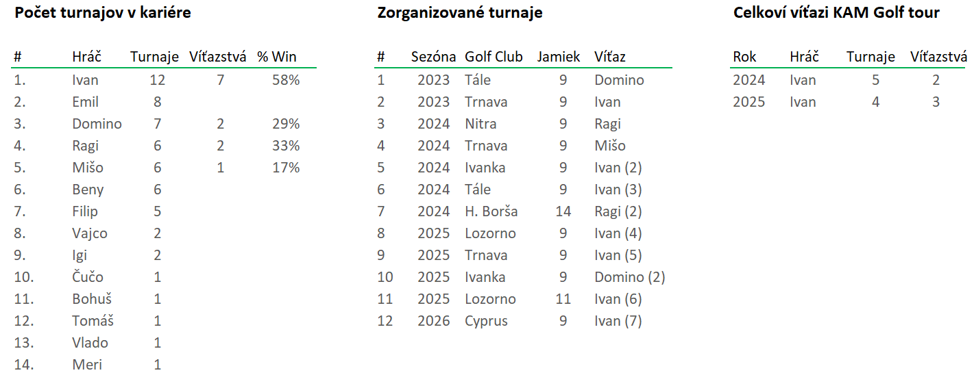 - KAM Golf tour pozostáva každoročne z 5-tich turnajov, každý je hraný na inom ihrisku.